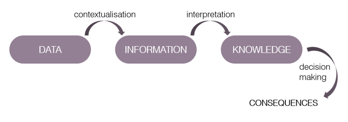 Data can be seen as the raw material of bits and bytes that can contribute to information, as human beings begin to contextualise data and understand what they mean. For instance, 15 degrees Celsius in outside temperature is a data point. In the context of a day in August in London, that data point turns into information which tells us about a lousy British summer. Further interpretation turns information into knowledge, which includes guidance on how to act (in this case: wear a coat. Or go abroad for your holiday). Knowledge therefore means ‘knowing what could be done’ and as such has action possibilities already embedded. Through decision-making, possibilities turn into realities and have consequences in the world (if I wear a coat, I won’t freeze). The relationship between data and decision making is visualised below. If you want to read more about the data – information – knowledge relationship, I would recommend chapter 2 of Tina Chini’s ‘Effective Knowledge Transfer in Multinational Corporations‘.