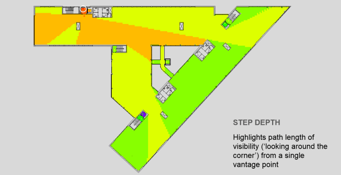 The second type of analysis we ran is a fully connected visibility graph, which highlights global patterns of visibility. With this we don’t just look at the size of the immediately visually accessible area, but ask how many isovists it takes until you’ve seen everything. Again, imagine you start from a single vantage point (shown as a white circle below) – we’ve chosen one of the staircases as the place you want to start. All immediately visible areas are shown in red – this is just the small landing of the staircase. Once you open the door to the open plan office space and step outside, you can see a larger area, shown in orange. Now imagine walking through all the orange spaces – everything you see from there is yellow, so is one step further away. From there, you can see the light green spaces and so on. Each step of visibility is like looking around the corner. If you run this analysis systematically from every starting point in a grid, you can calculate average path length (also called mean depth). A mean depth value of 4 for example means you have to look around the corner four times from this place until you’ve seen everything there is.