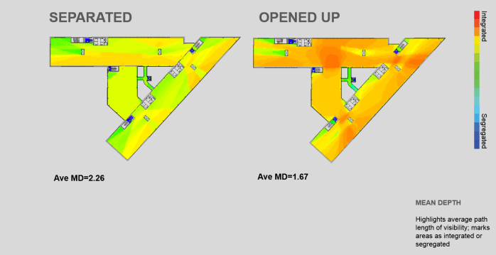 Two caveats need to be mentioned: firstly, it would have to be assessed how an opening up would adhere to fire regulations (if this was to be realised) and secondly, it would have to be assessed whether more integration is in fact needed and required. Large open areas and long lines of sight certainly enable some behaviours (seeing others, bumping into colleagues, getting a sense of awareness of what is going on), but could be inhibiting to other behaviours (concentration, team identities, getting a job done).