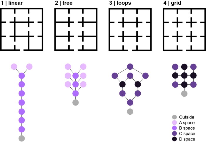 Four layout alternatives of a 3×3 grid creating distinct affordances for movement and encounter